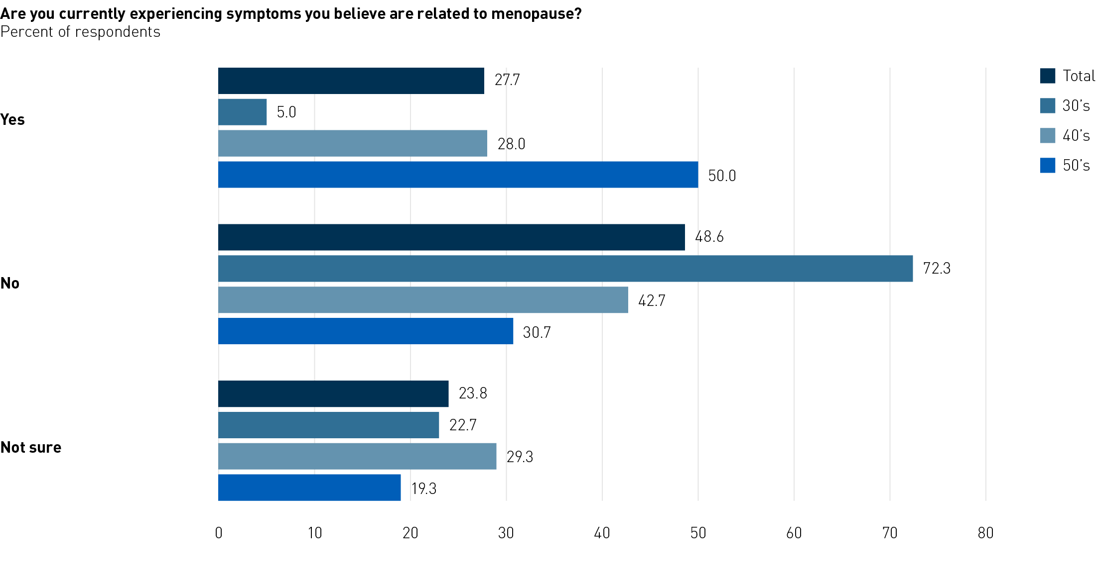 27.7% of respondents reported experiencing menopausal symptoms. By age group, 5.0% of women in their 30s, 28.0% in their 40s, and 50.0% in their 50s reported such symptoms.