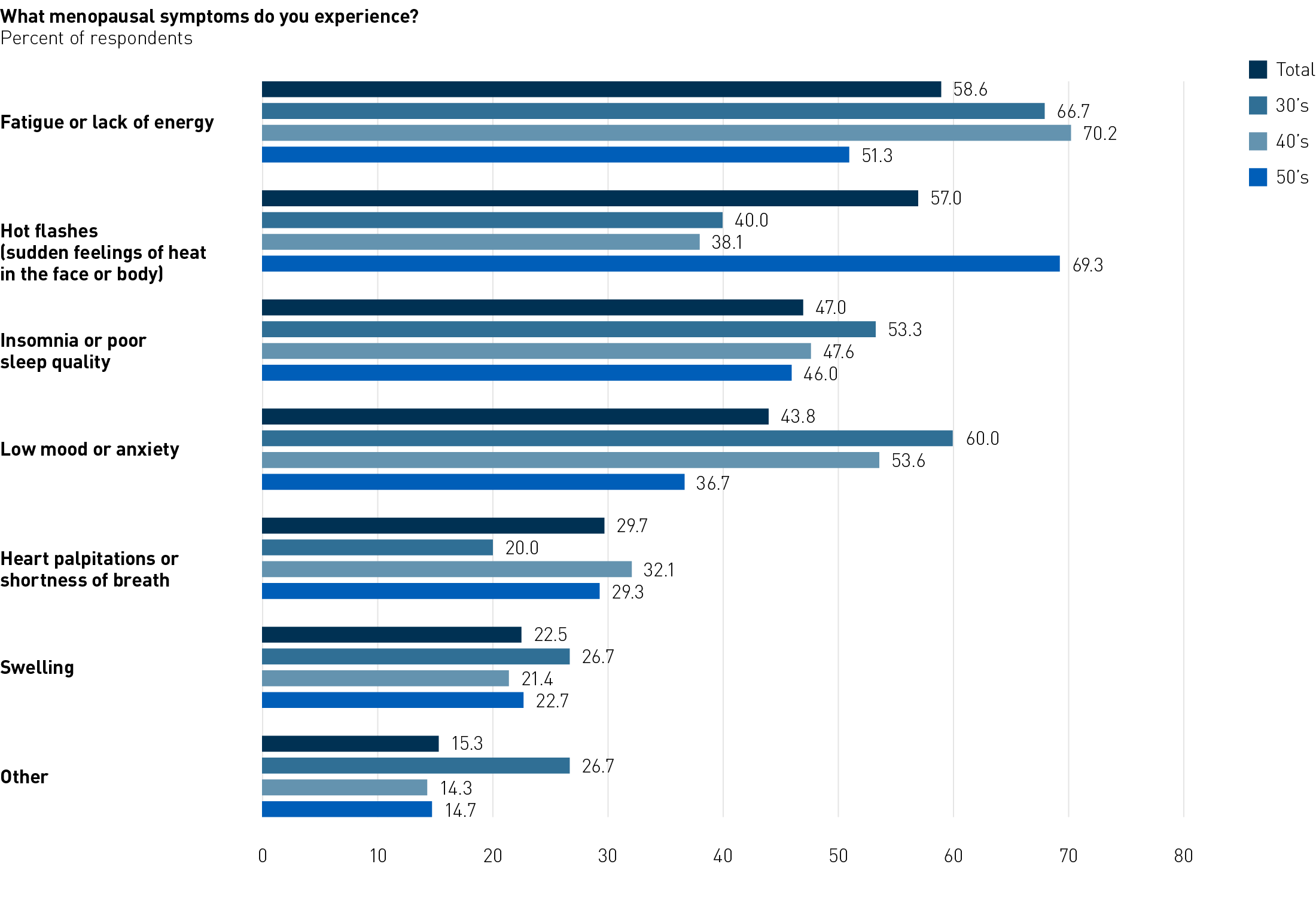 Among all respondents with menopausal symptoms, “fatigue or lack of energy” was the most common, reported by 58.6%. In particular, about 70% of those in their 30s and 40s experienced this symptom. Among those in their 50s, “hot flashes” were the most common, reported by 69.3%.