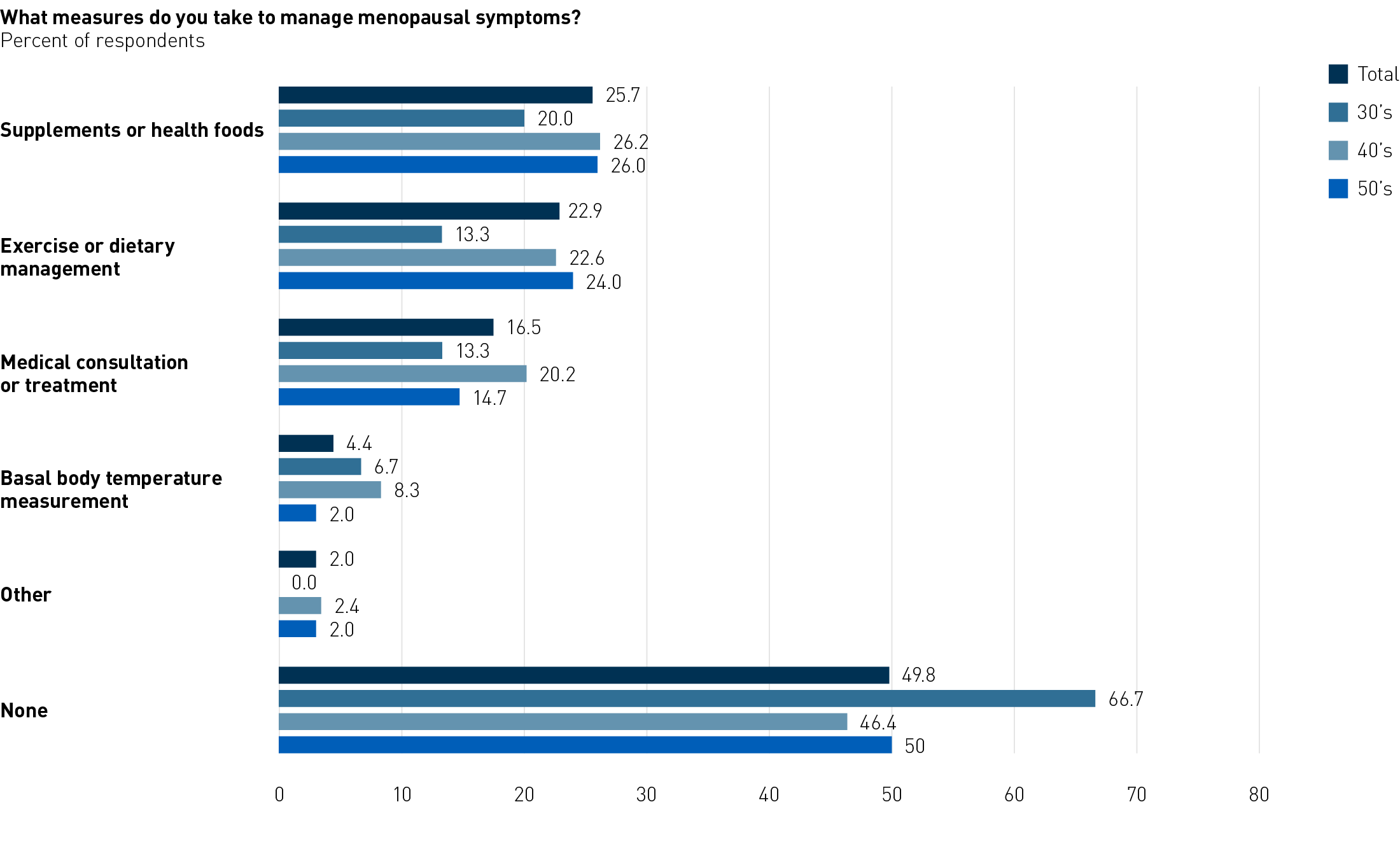 When asked about measures taken to address menopausal symptoms, the largest group at 49.8% of respondents answered that they do not take any specific measures. Some women reported using supplements or health foods (25.7%) and engaging in exercise or dietary management (22.9%) as coping strategies. However, regardless of age group, about half of the respondents did not take any measures. Additionally, only 4.4% of women reported measuring their basal body temperature as part of their care.
