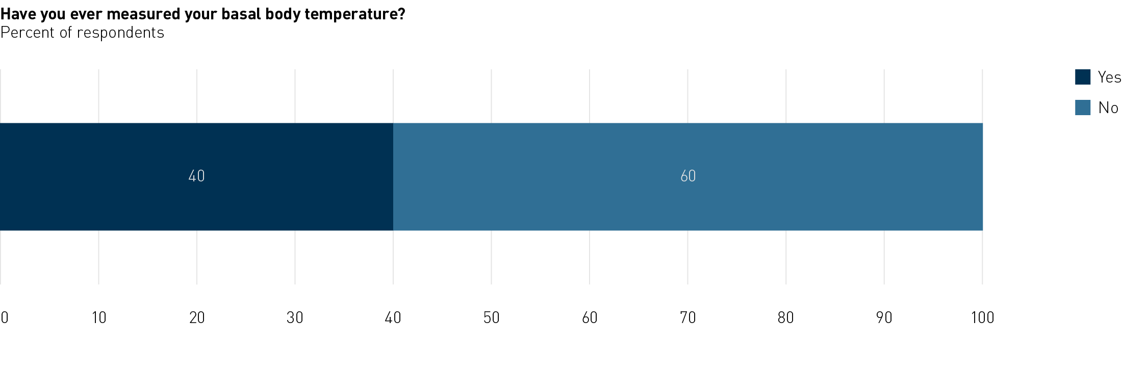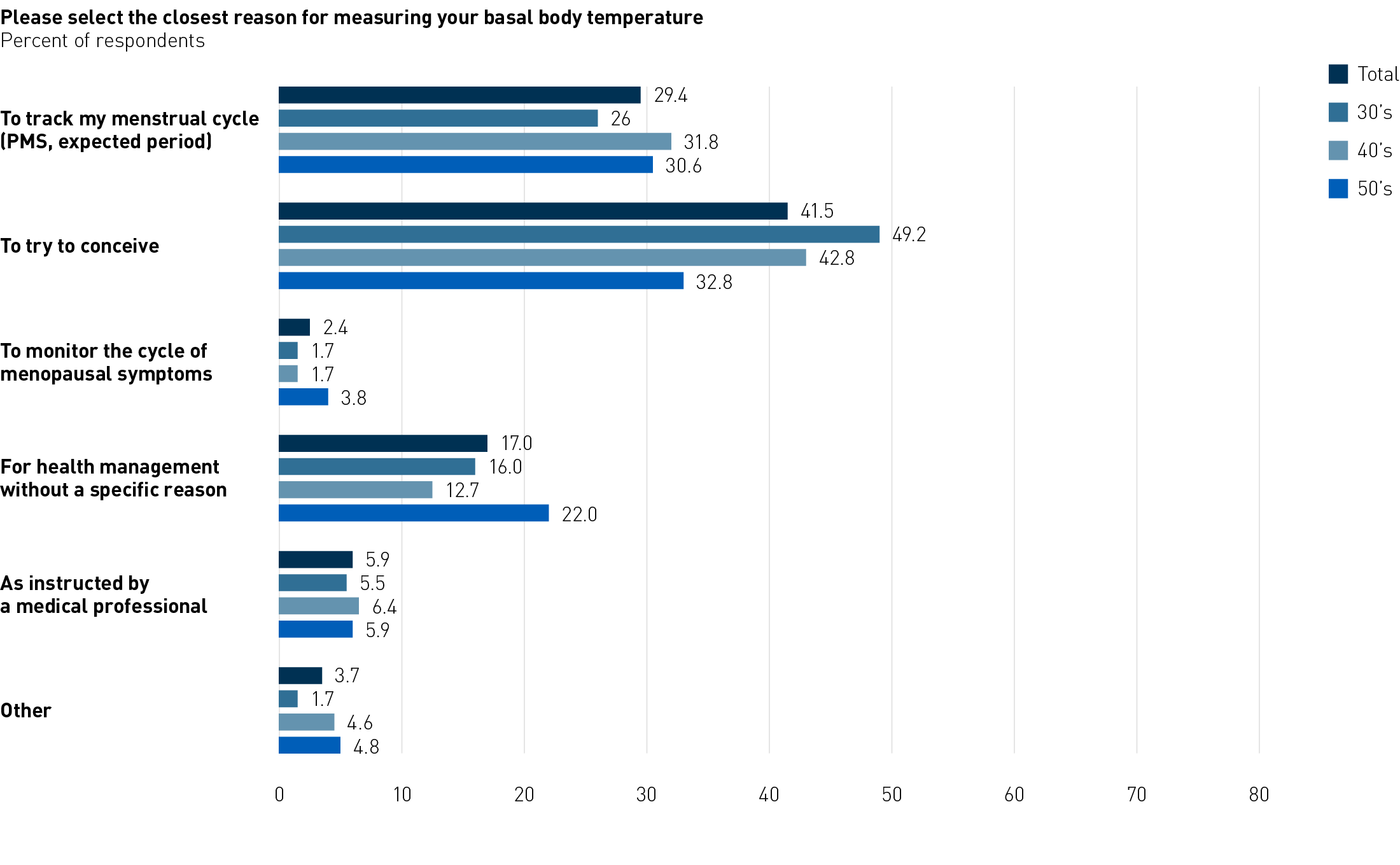 60 percent of respondents have measured their basal body temperature. When asked about their reasons, 41.5% said it was “as part of trying to conceive,” followed by 29.4% who measured it “to understand their menstrual cycle.” Only 2.4% reported measuring it “to understand menopausal symptoms.”