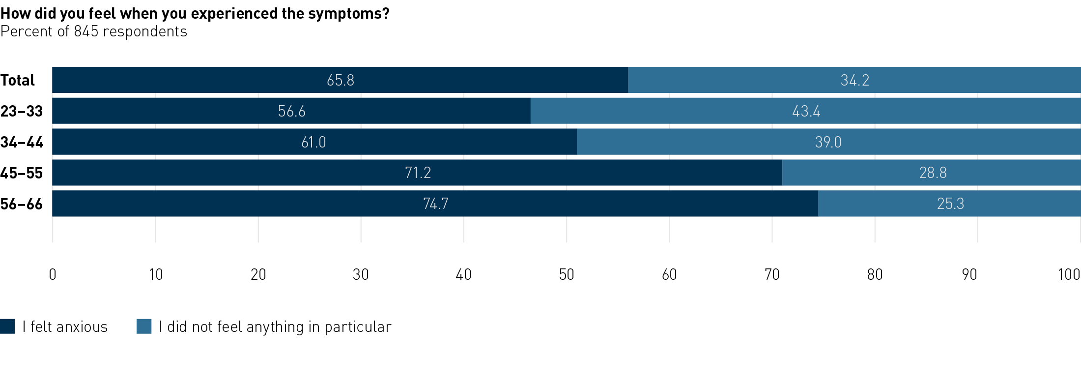 A total of 84.6% of respondents reported experiencing early symptoms of AFib, such as palpitations and shortness of breath, in their daily lives. 65.8% said they felt anxious when experiencing these symptoms. By age group, the proportion of respondents who felt anxious increased with age, with more than 70% of women aged 45 and older reporting feelings of anxiety.
